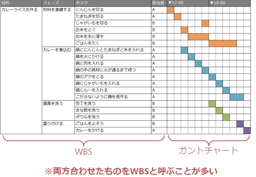 WBSなどとも呼ばれたりしますが、仕事をいくつかのタスクに分解して、それぞれのタスクを誰が担当して、いつまでにそれを完了させるのかをスケジュール表にして、進捗状況を管理するものです。