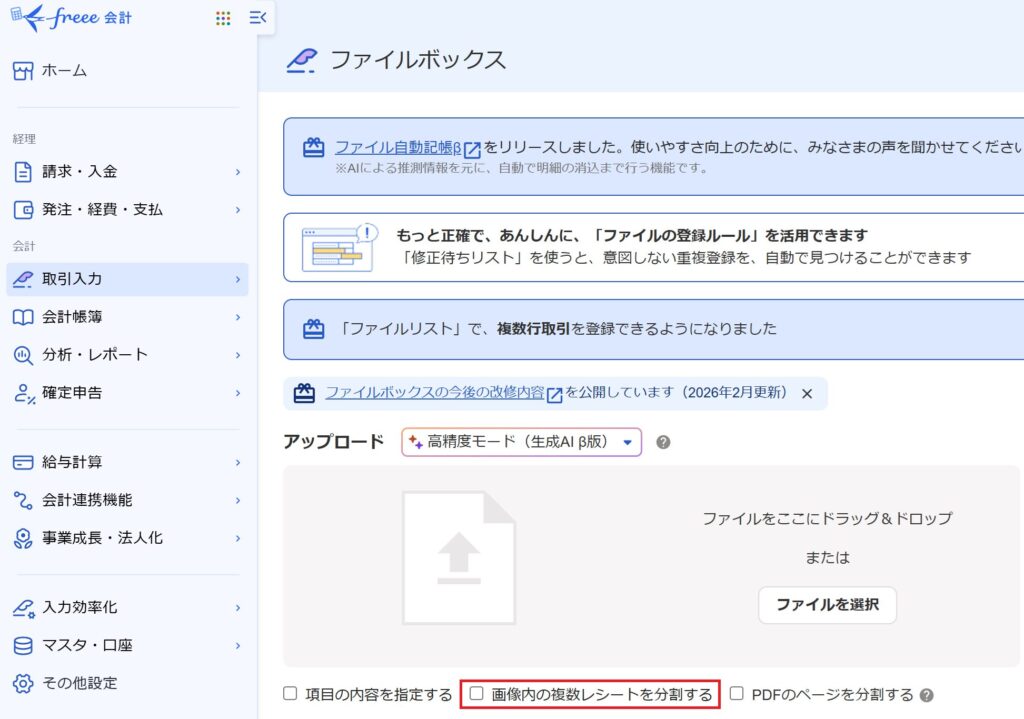 freeeだと、1枚の写真のなかに複数枚のレシートをまとめて撮影している場合でも、自動で分割してくれる機能もあります。