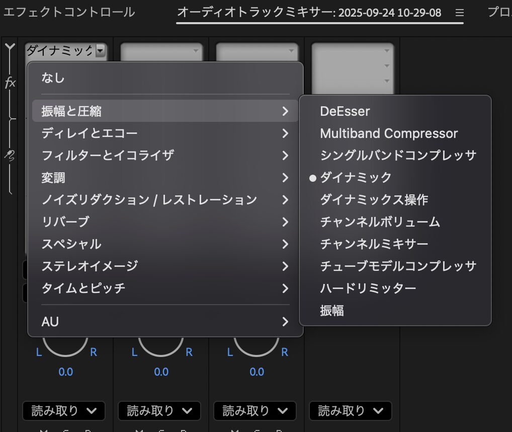 「オーディオトラックミキサー」→「振幅と圧縮」→「ダイナミック」を選択して、
