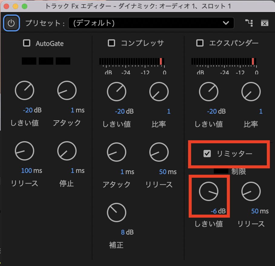 一般的に、-6dBぐらいが動画においてはちょうどいい大きさとされていて、それ以上大きな音になるとうるさく感じるので、-6dB以上の大きさにはならないように、リミッターをかけています。