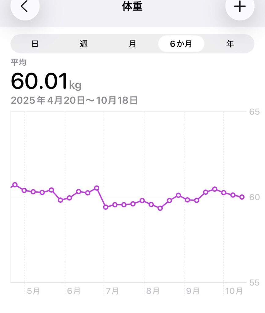 一応体重は毎日測って、スマホアプリに記録を残していますが、ほぼ横ばいの状況です。