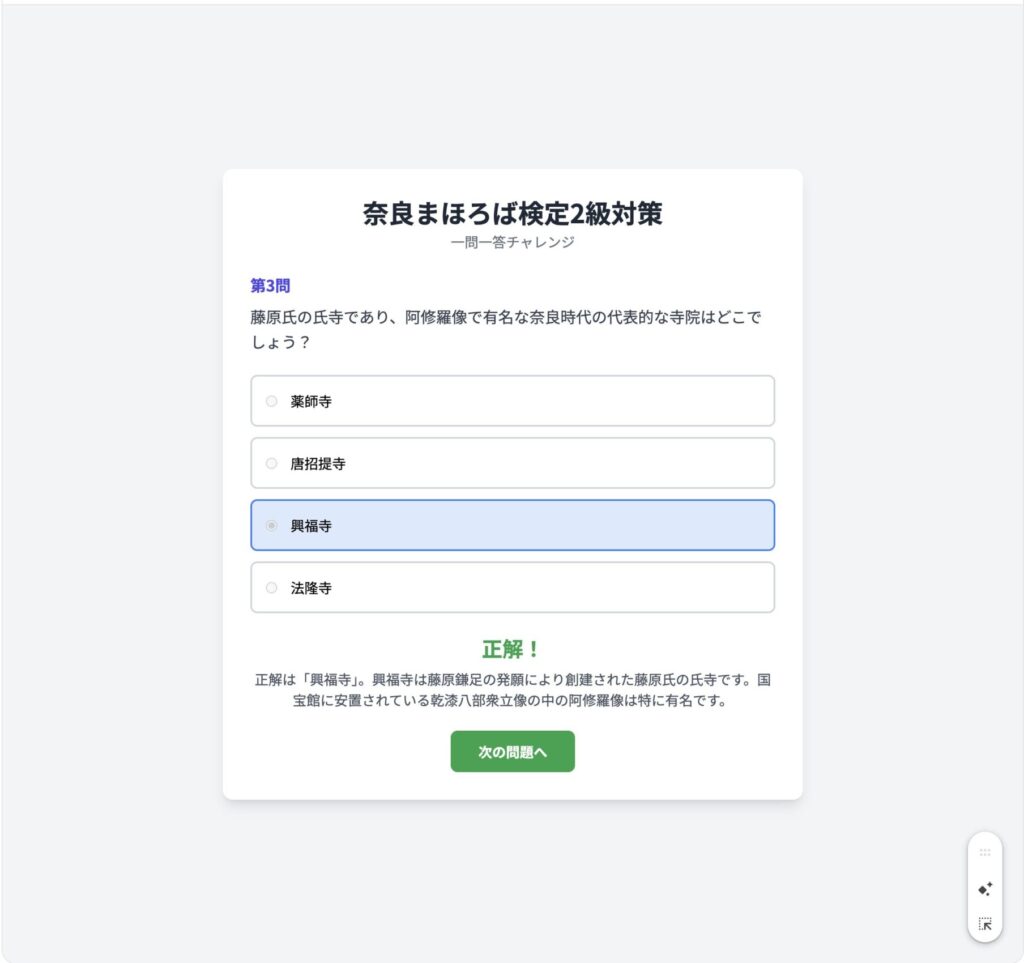 奈良検定は4択のマークシート形式なので、それと同じように、4つの選択肢から自分で選び、正解か不正解かを判定してくれるドリルです。