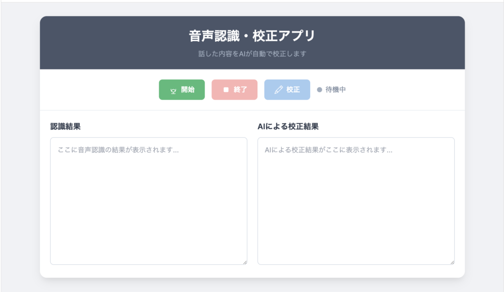 このアプリは、音声入力・修正という流れを、アプリ内でボタンを押すだけで完結できるようにしました。