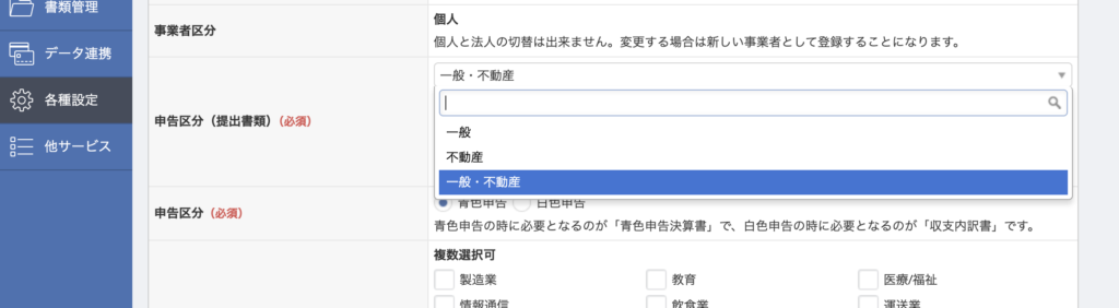 MFクラウドの場合、「各種設定」→「事業者」から、「申告区分」を「一般・不動産」にすると、不動産用の経理ができるようになります。
